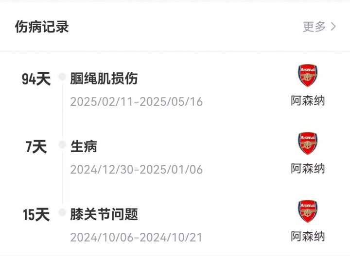 这是哈弗茨2025年度第二次遭遇伤病困扰,今年二月他在迪拜集训期间遭遇腿筋撕裂,曾因此缺席18场英超及欧冠赛事。