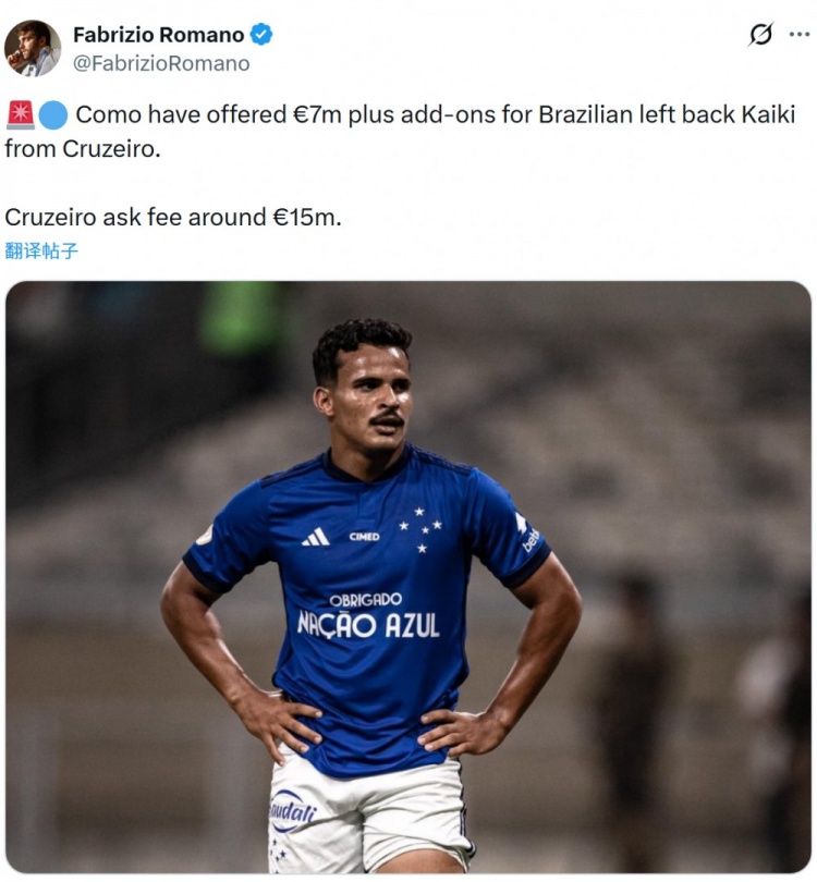 罗马诺透露,科莫对效力于克鲁塞罗的巴西左后卫凯基感兴趣,已经提交了700万欧+浮动的报价,而克鲁塞罗要价约1500万欧元。